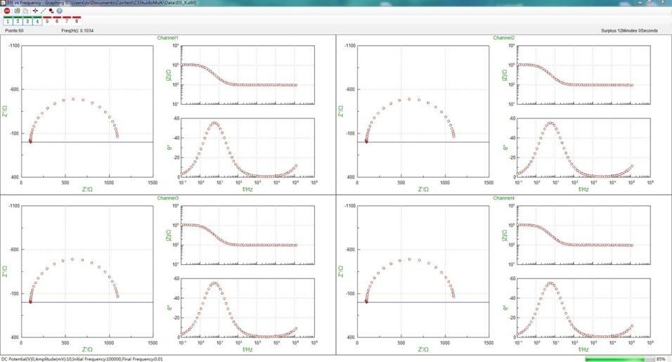 The customer can choose a same electrochemical technique in every channel. For example, among 8 channels, you can choose to run 4 channels to all do EIS measurement. Set the parameters just one time, then EIS measurement in each channel will be conducted at the same time.(Here is an example of using the 4 channels. You can run the 8 experiments at the same time on one window)