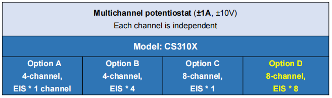 Multichannel potentiostat/ galvanostat model CS310X (Option D) is the 8-channel potentiostat. And all the slots are occupied with potentiostat boards. It equals that you can have 8 sets independent potentiostat/galvanostat, and they're integrated in one chassis.