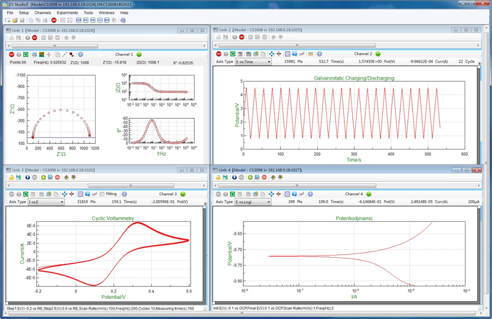 In each channel, you can also conduct different experiments. As is shown in the below picture, EIS, galvanostatic charge and discharge, CV, and polarization curve tests are conducted at the same time.(Here is an example of using the 4 channels. You can run the 8 experiments at the same time on one window)